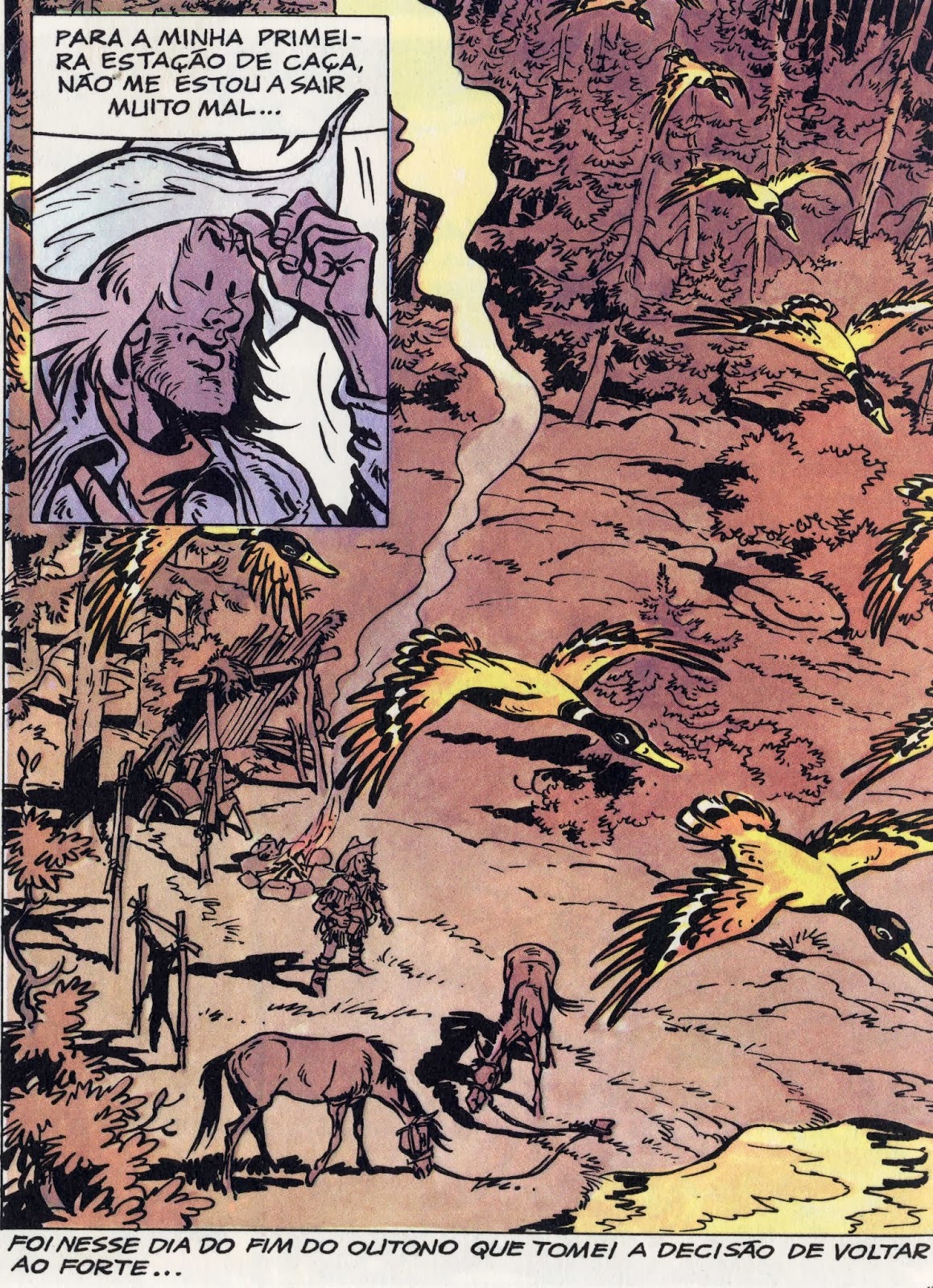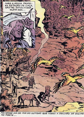 Duas figuras minúsculas movimentam-se, ao longe, num qualquer sopé duma zona montanhosa do Oeste americano. Na segunda vinheta distinguimos uma raposa perseguindo uma lebre, até que (3.ª vinheta) "PUM", o predador é abatido, surgindo agachado por entre os arbustos um homem loiro, barba por fazer, chapéu de cowboy e rifle fumegante. Pelo último quadradinho da primeira prancha, verificamos que tem atavios de caçador. Virada a página, Buddy Longway (é dele que se trata) dirige-se para o seu acampamento. Caçador de peles, percebemos agora.